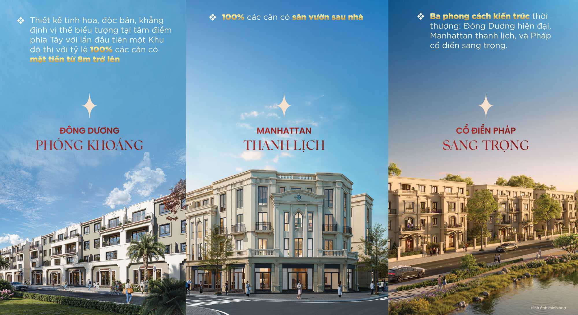 100% các căn có mặt tiền từ 8m với 3 phong cách kiến trúc đa dạng nhưng đầy tính thẩm mỹ đồng nhất: Đông Dương hiện đại, Manhattan thanh lịch, cổ điển Pháp sang trọng,